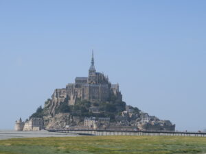 モン・サン=ミッシェルは、708年の創建伝承から始まり、中世を通じて巡礼地・要塞・修道院として発展した、1300年以上の歴史をもつフランス屈指の聖地です。潮の満ち引きにより島と陸地を行き来する独特の地形と、ロマネスク〜ゴシック建築が重層的に積み重なった姿は、現在も世界遺産として高く評価されています。 ここは、潮の干満に、ついては非常に激しいので、陸と島(モンサンミッシェル)の島が歩く事が出来、干潟ウォキングツアーもある。 たたし、ガイドなしでは、歩くことは禁止されている。そのガイド付きツアーに参加すれば、広大な干潟を裸足で歩く事が出来、島を 囲む広大な島を一周すれば、雄大な自然を体感でき、新しい人生の思い出になる。 野生動物とも思える、ヤギさんの訪問がある、暫く滞在していたが、いつの間にかにいなくんる。